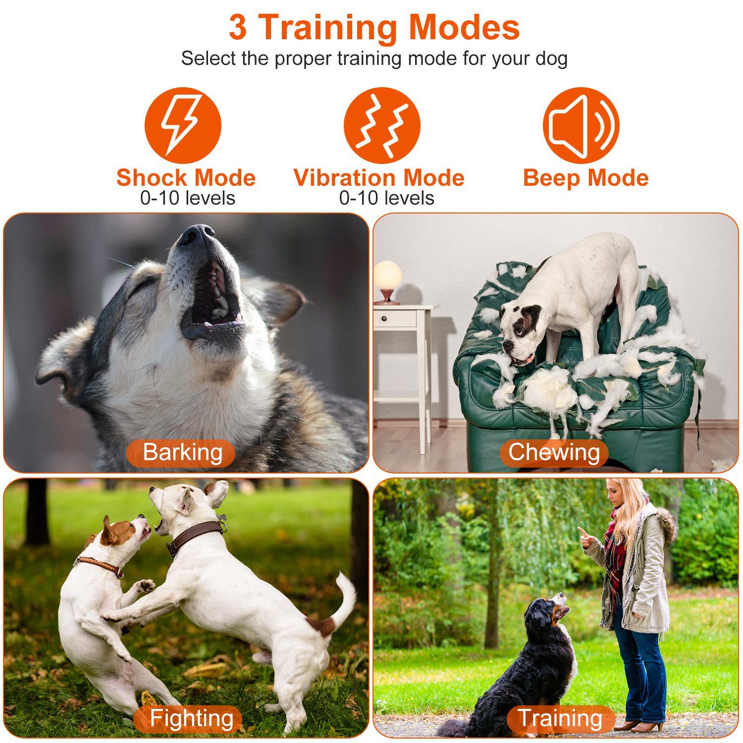*3 Training Modes & 2 Channels*:This dog training collar features beep; vibration; and shock modes. With 0-10 level adjustable intensity; you can adjust the stimulation level(only for vibration and shock modes) whenever needed. The transmitter comes with 2 channels to support training 2 dogs simultaneously. Aside from this 2 in 1 training set; you can buy an extra collar if you keep 2 dogs at home.
